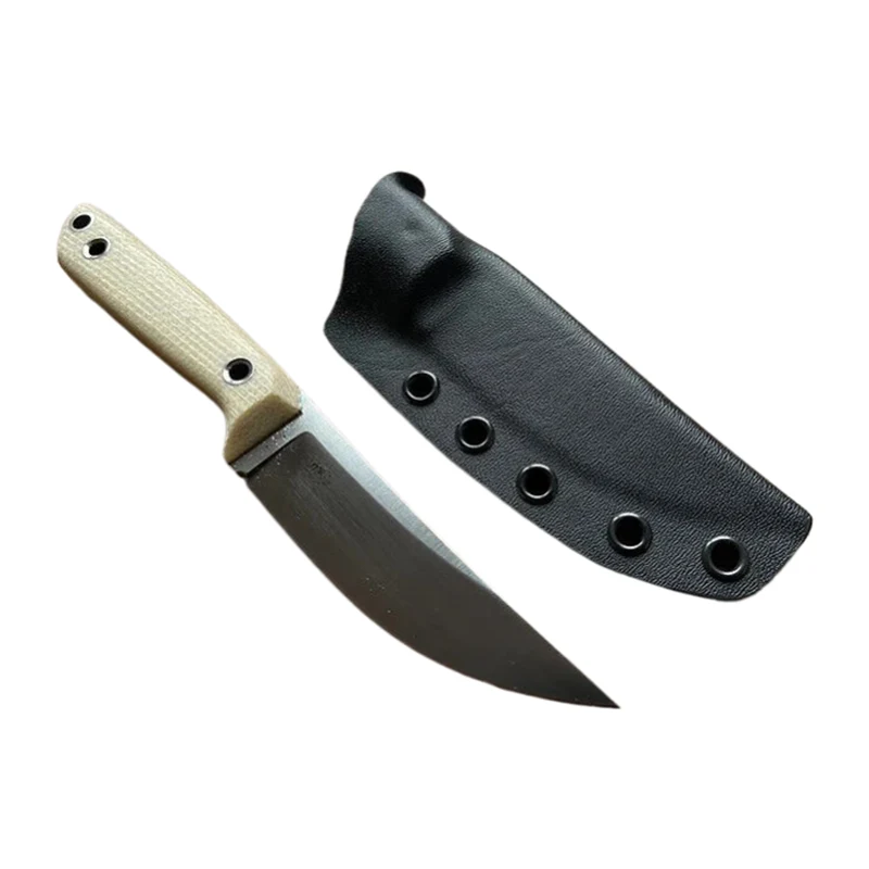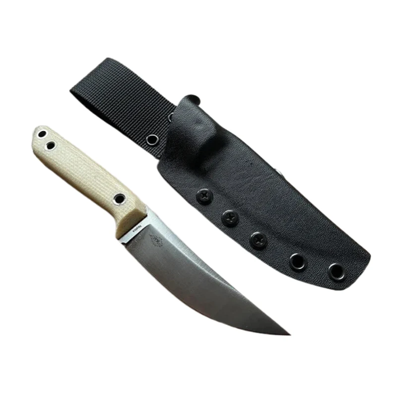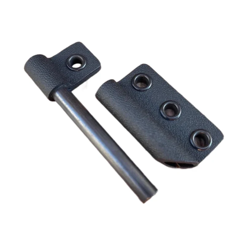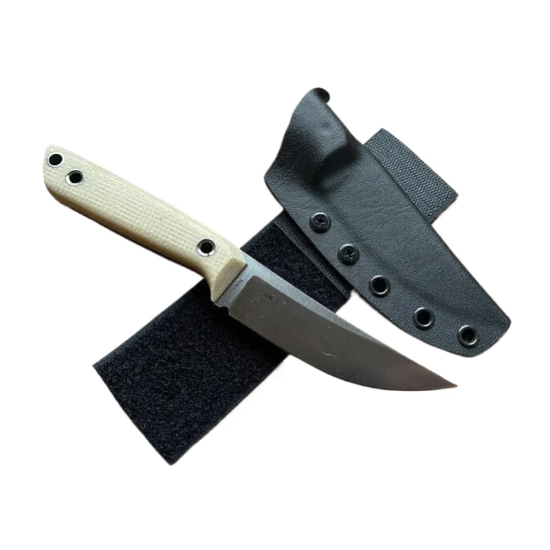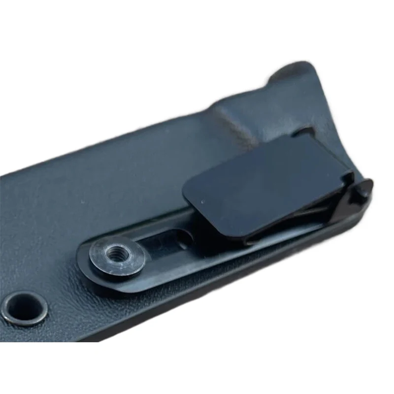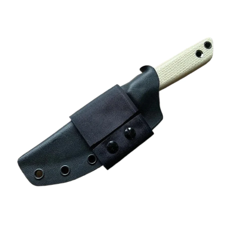 Als je het mes wat lager wilt dragen, raad ik een nylon draagriem met Kydex-houder aan. Klittenband- of leren lussen zijn ideaal om het mes aan de riem te dragen. Ook is het klittenband een praktische oplossing om het mes aan de riem van je rugzak te bevestigen. Naast de Kydex schede kan ik een Fire Steel houder bevestigen, optioneel met Fire Steel (80mm lang).