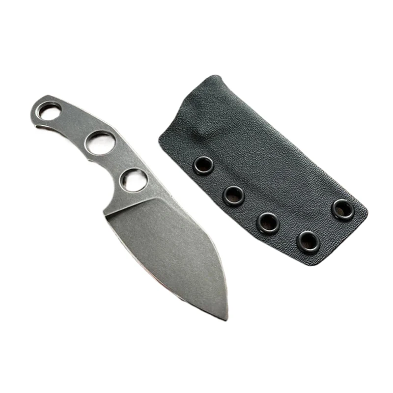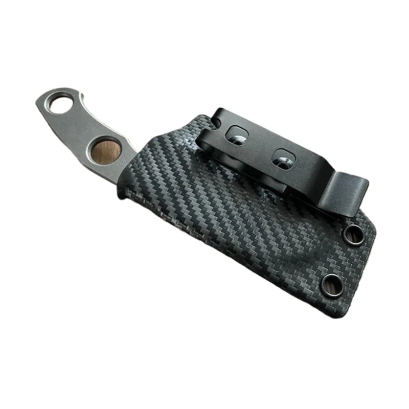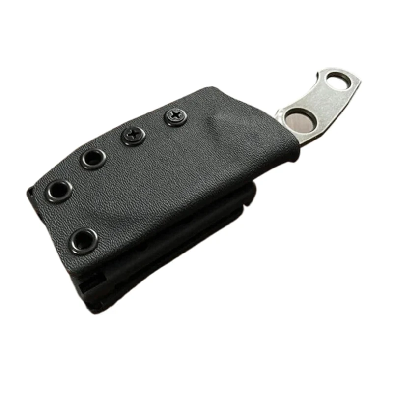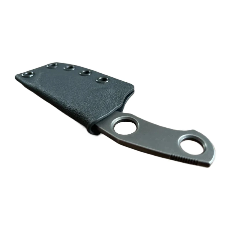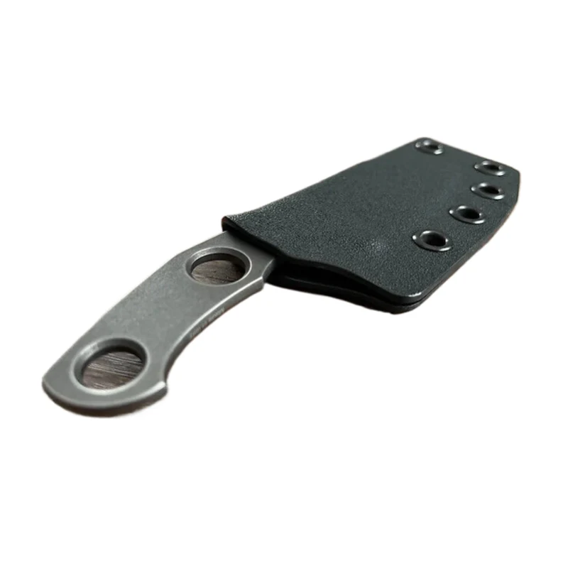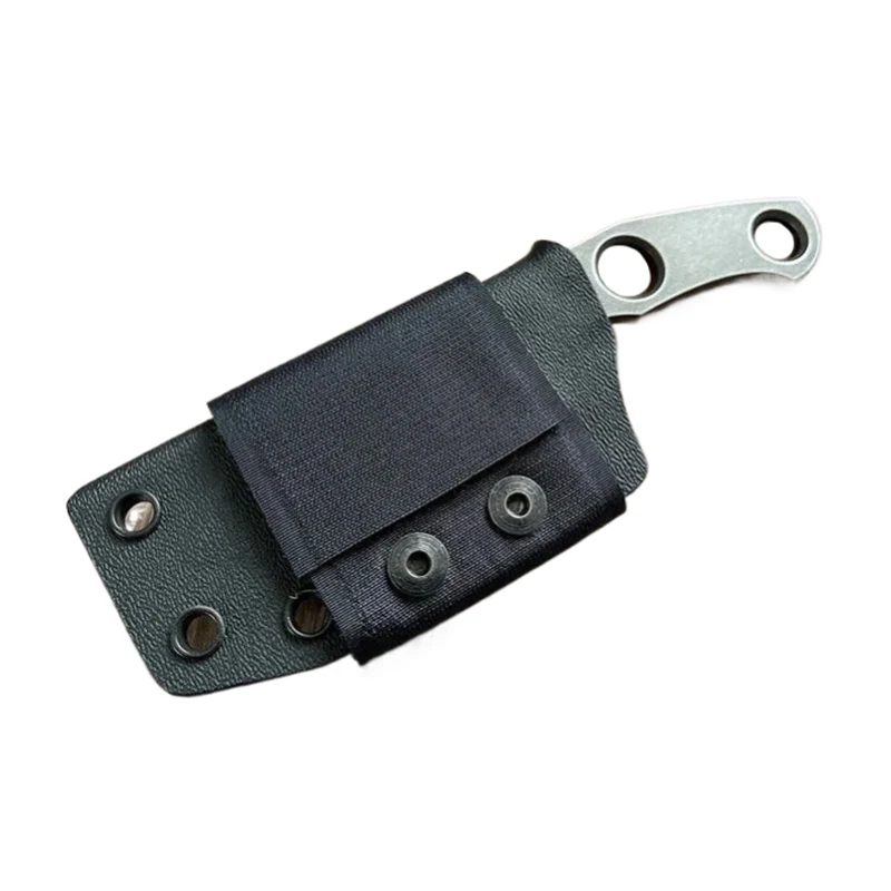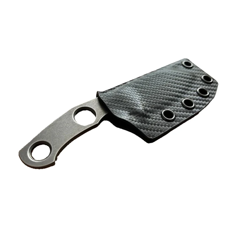 Aan de punt van de kydex schede heb ik twee oogjes bevestigd zodat het lichte mes ook onopvallend om de nek gedragen kan worden (nekmes).