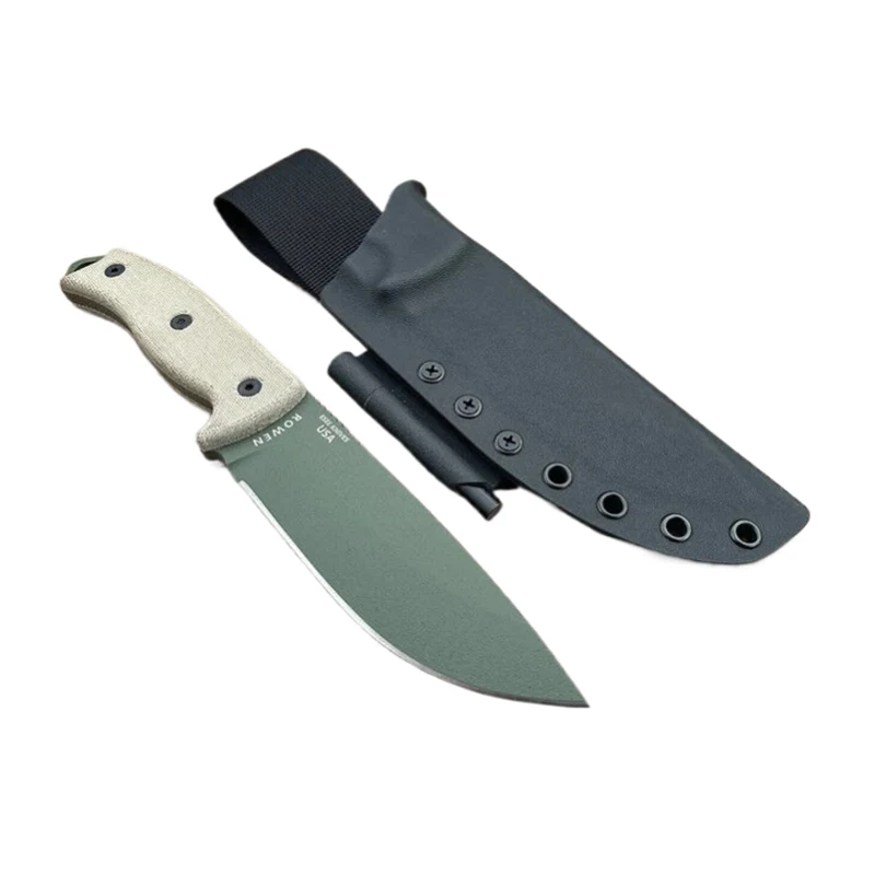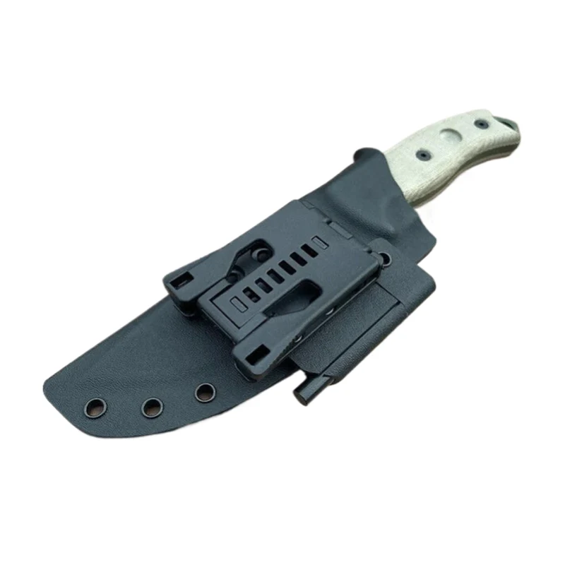 Een Multi-Lok is ideaal om het tactische mes op traditionele wijze horizontaal of verticaal aan je riem te bevestigen. Als je het mes wat lager wilt dragen, raad ik een nylon draagriem met Kydex-houder aan. Klittenband is ideaal om het mes aan de riem te dragen. Naast de Kydex schede kan ik een Fire Steel houder bevestigen, optioneel met Fire Steel (80mm lang).